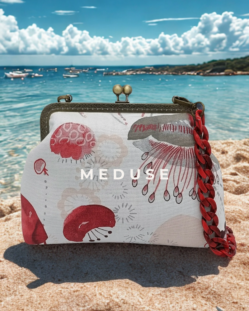 Leggera come una medusa che danza tra i fondali, questa borsa unisce l’eleganza dei dettagli vintage al fascino marino di un pattern vivace e sognante.