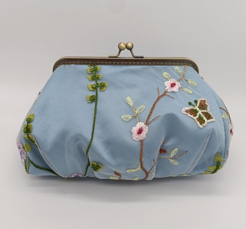 La borsa ha una chiusura clic/clac color bronzo, di un materiale pregiato, cucita a mano senza uso di collanti.